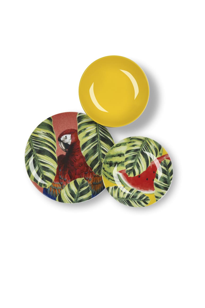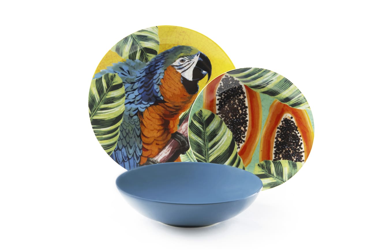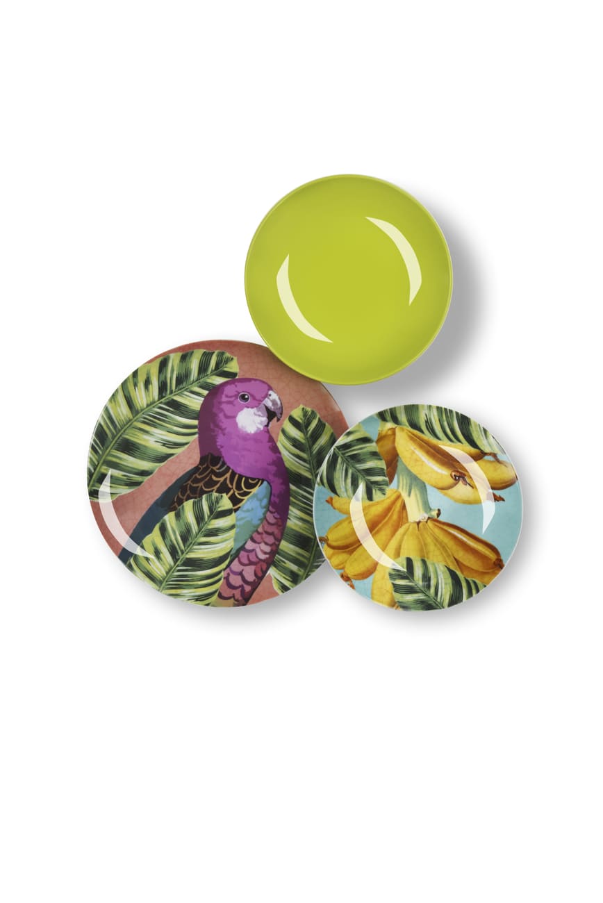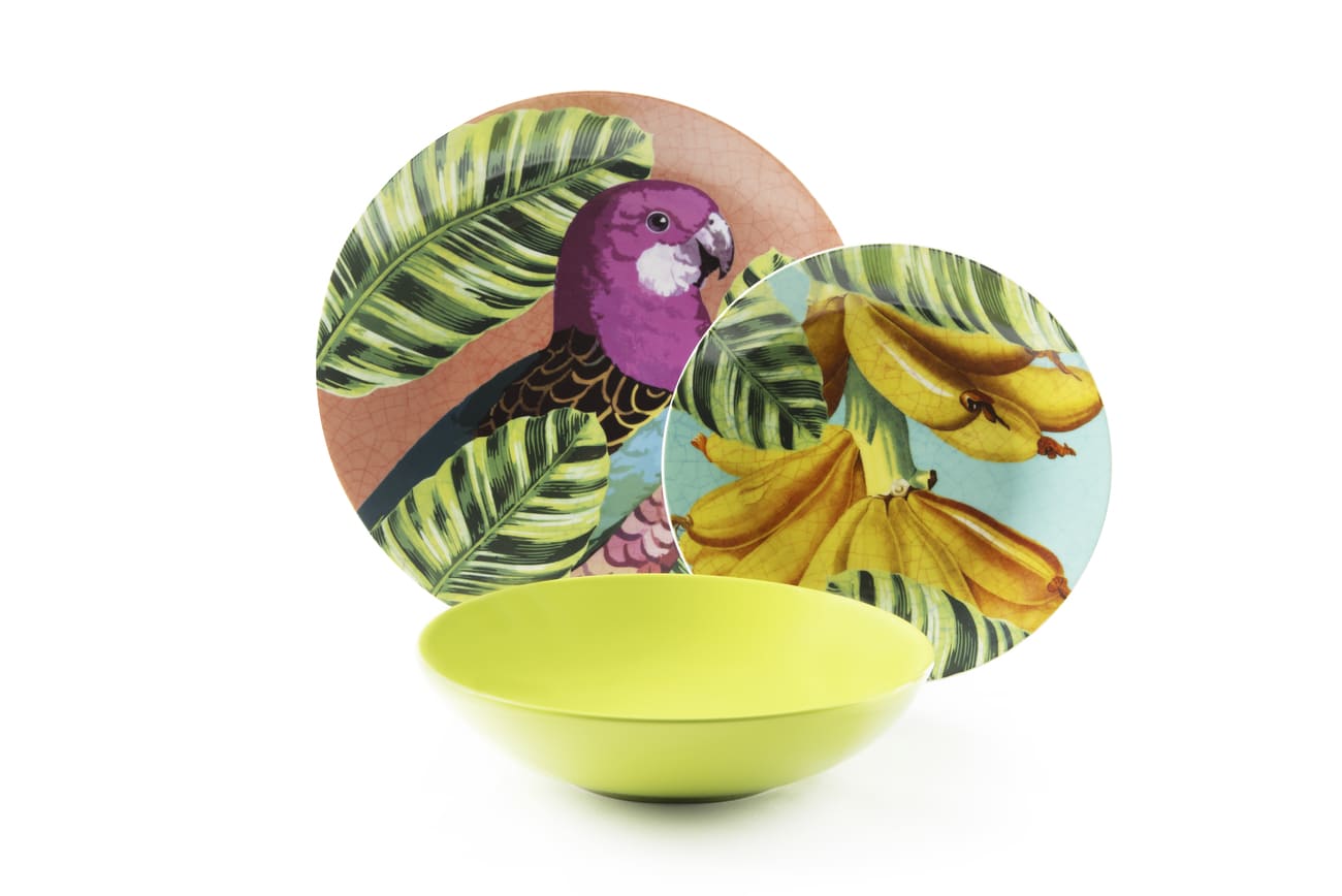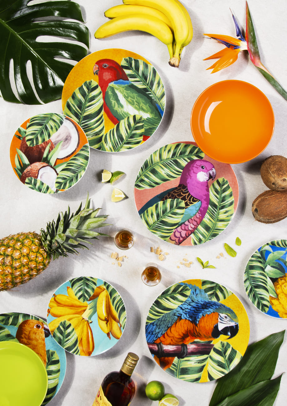 Dieses ausgefallene Teller Set Havana Vögel zeigt tropische Vögel und Obst-Motive.