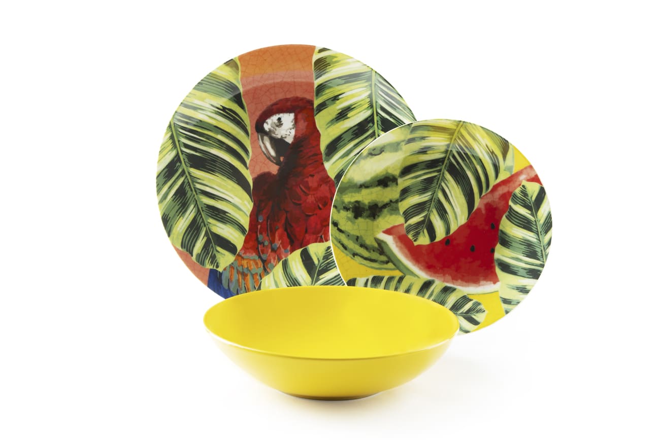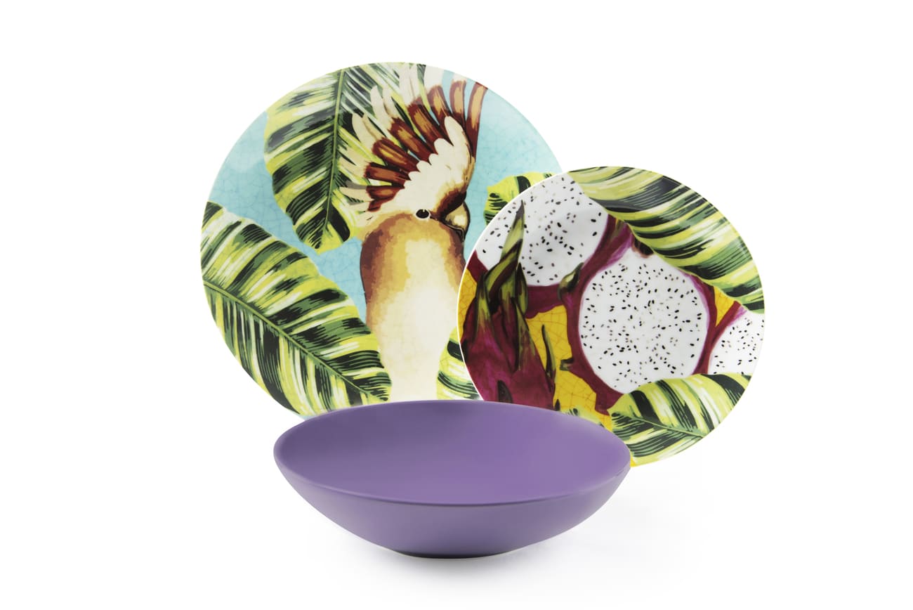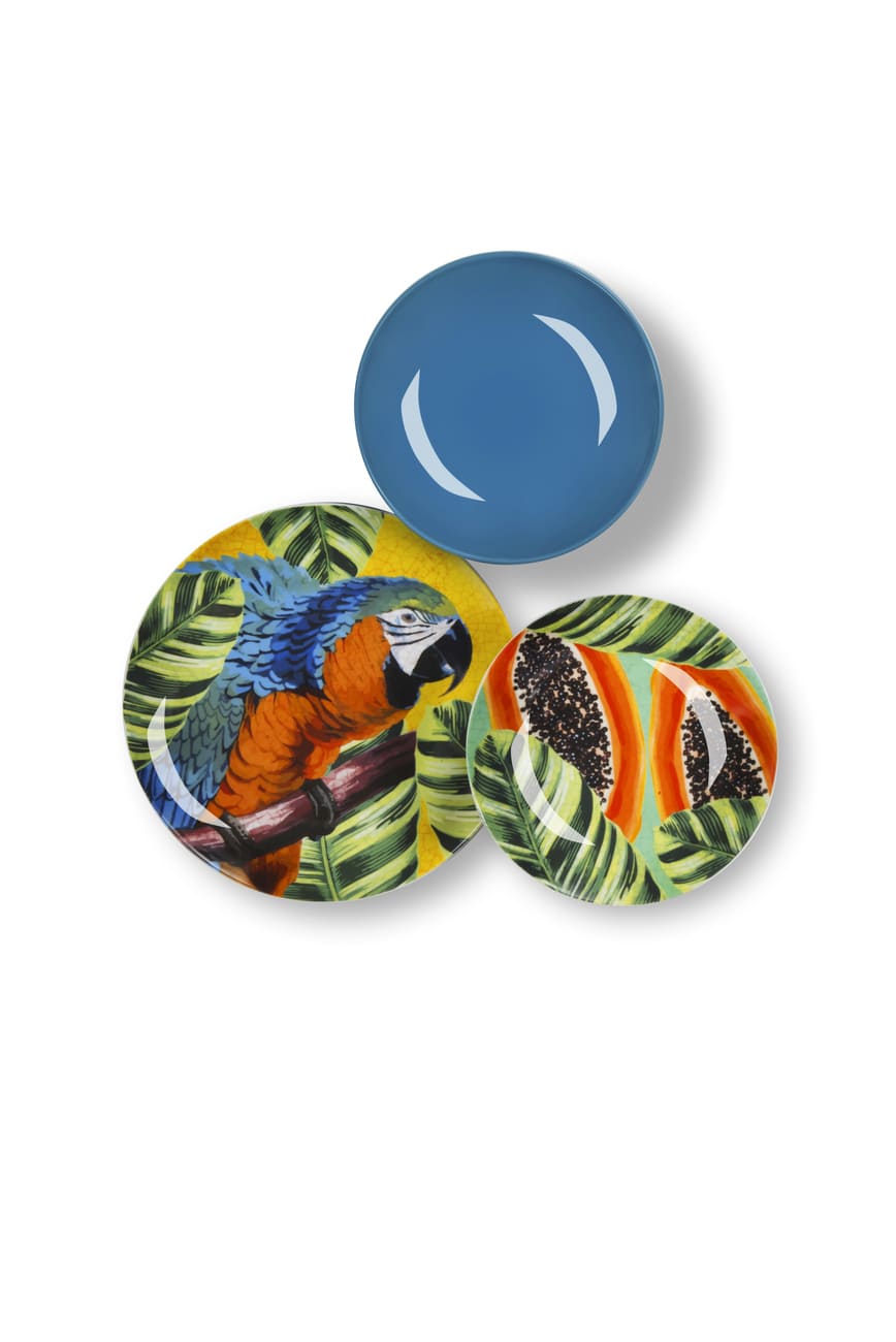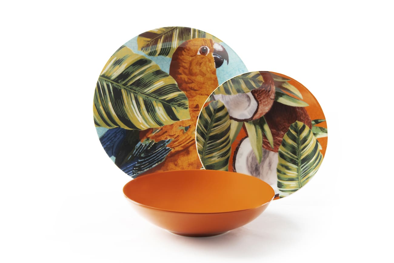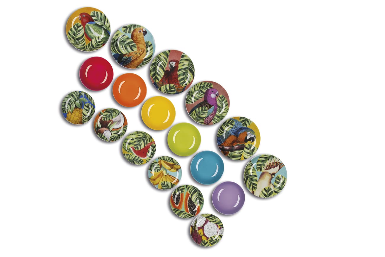 Dieses ausgefallene Teller Set Havana Vögel zeigt tropische Vögel und Obst-Motive.