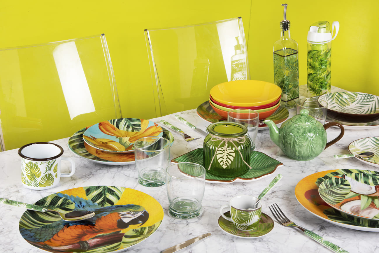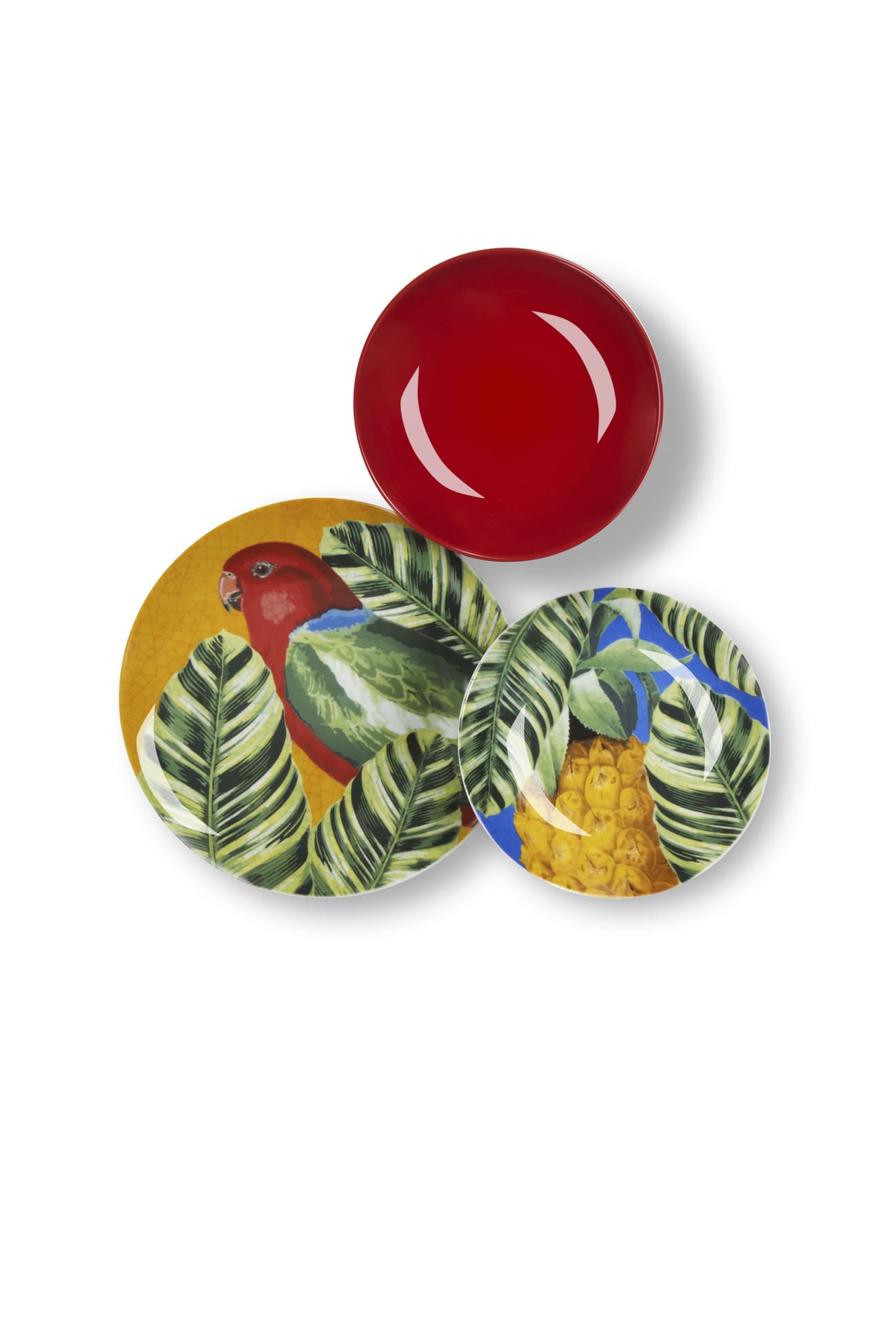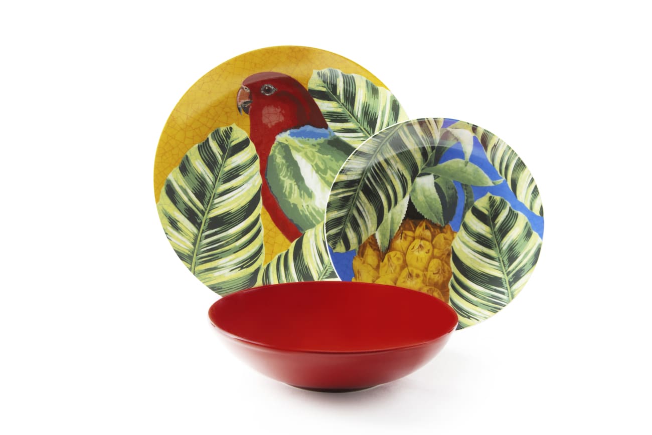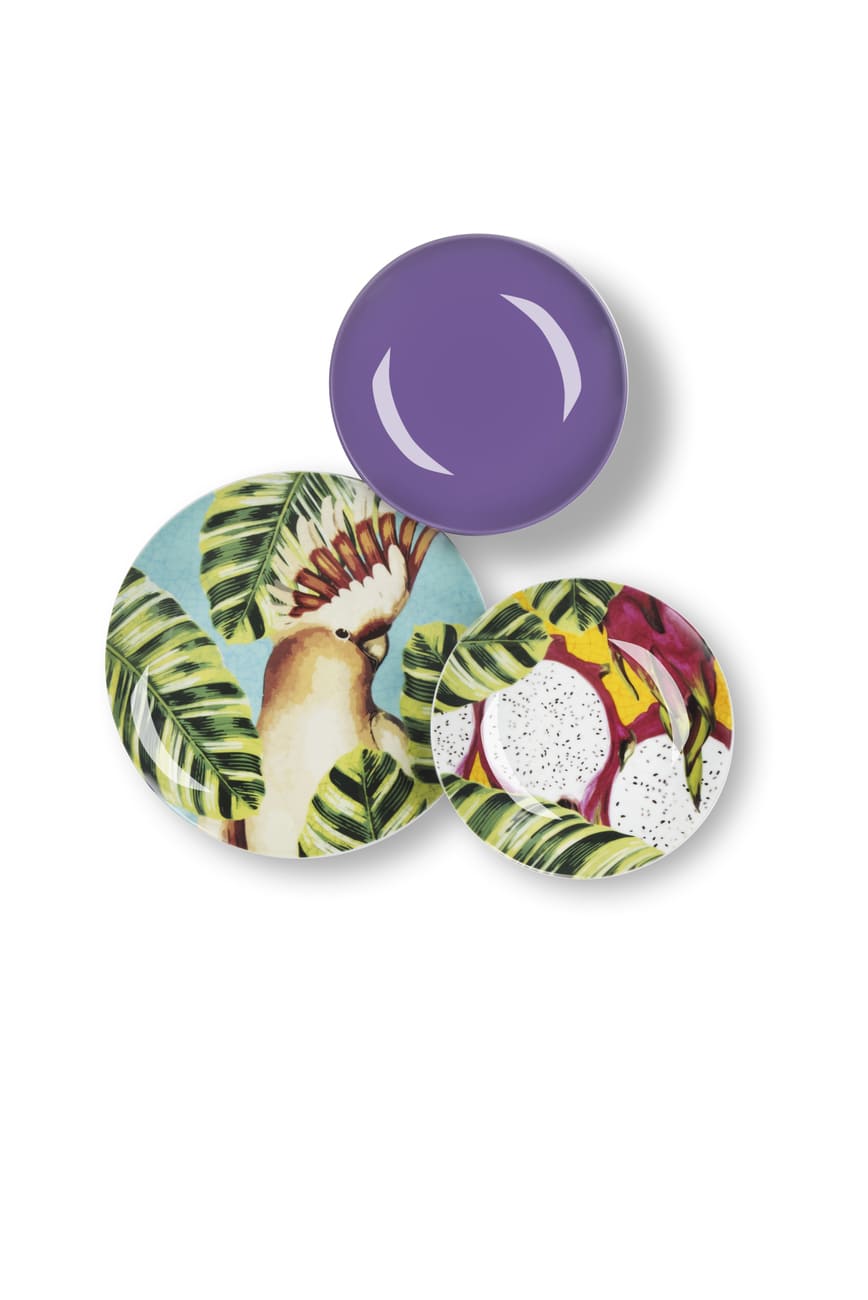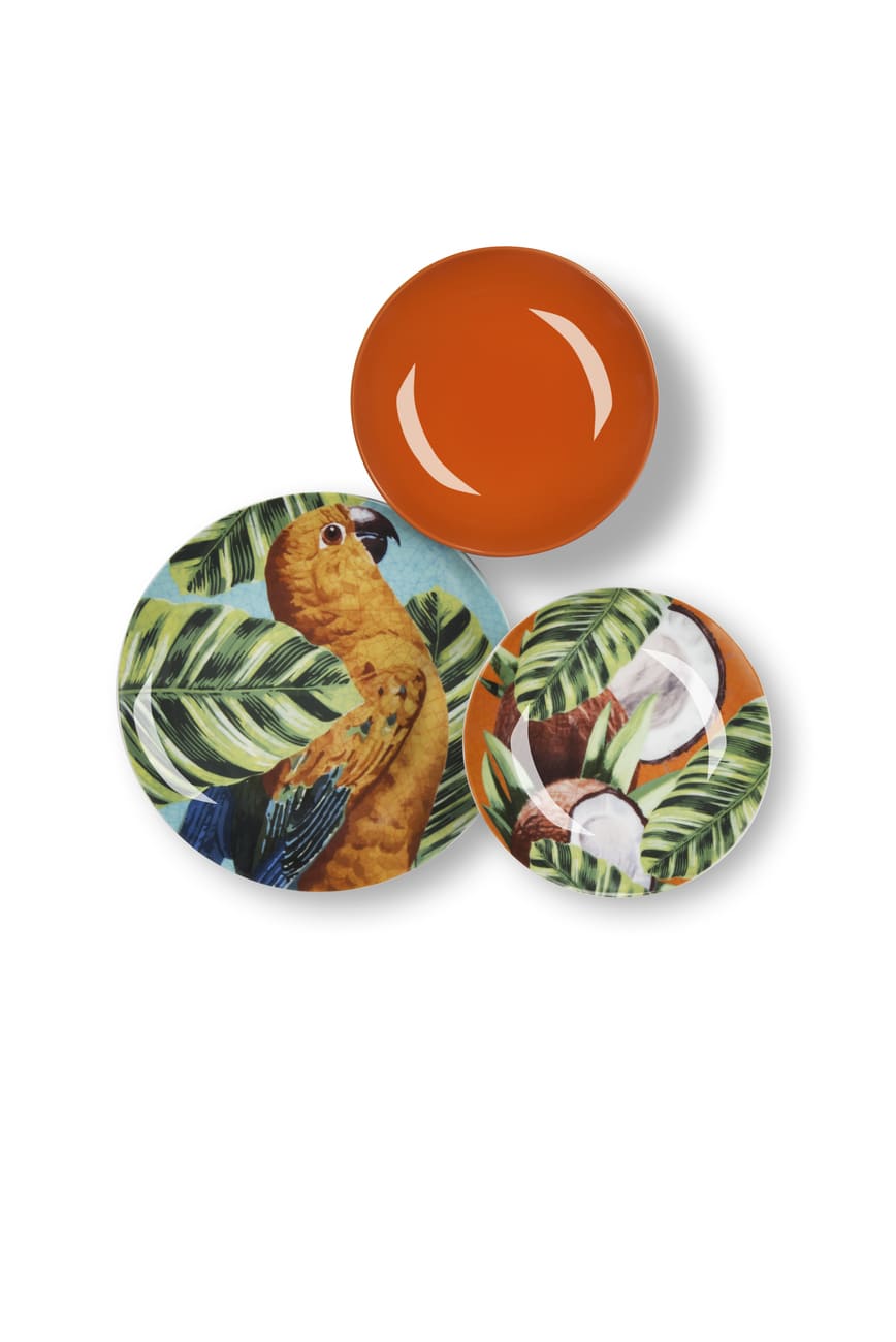Dieses ausgefallene Teller Set Havana Vögel zeigt tropische Vögel und Obst-Motive.