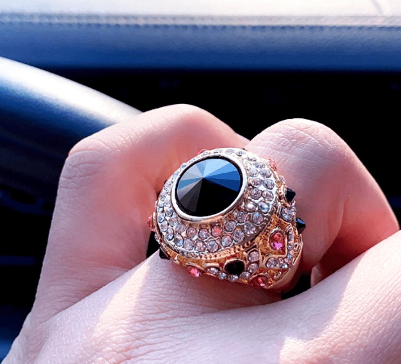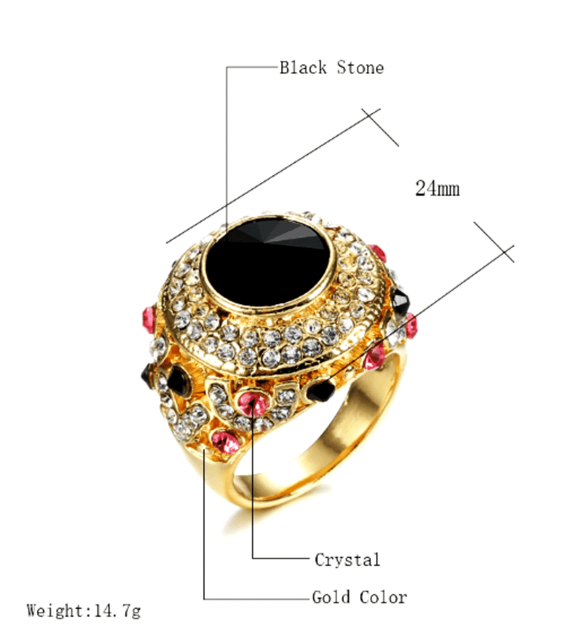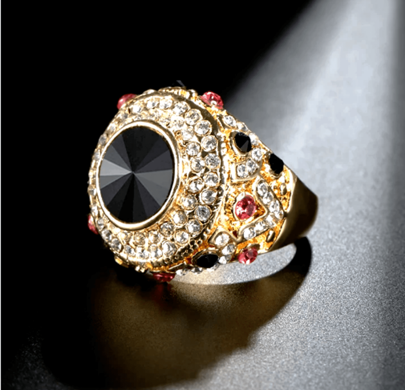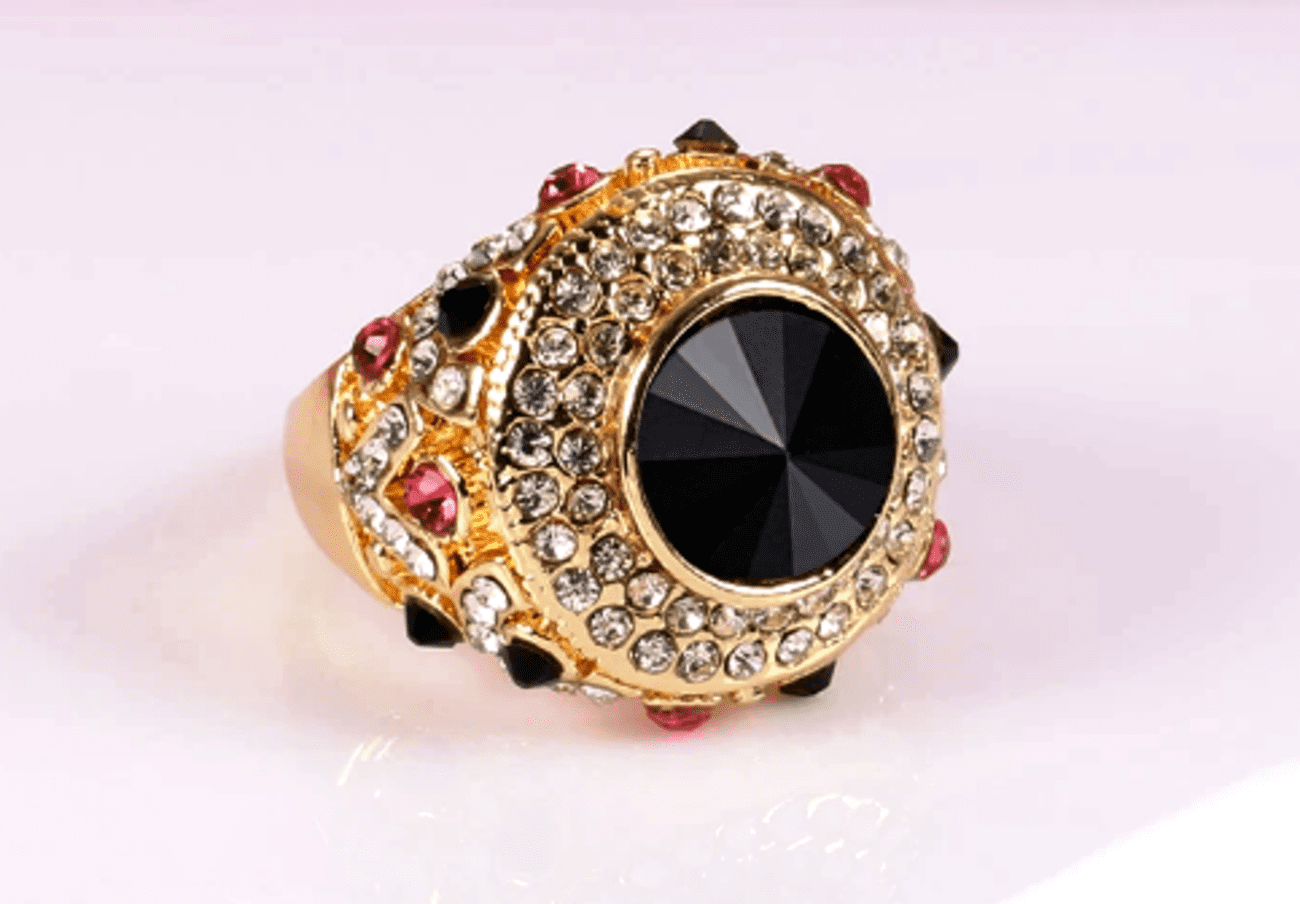 Dieser Modeschmuck-Ring ist aus einer Kupfer-Legierung und mit einem großen schwarzen Hauptstein und kleinen bunten Glassteinen gefertigt.