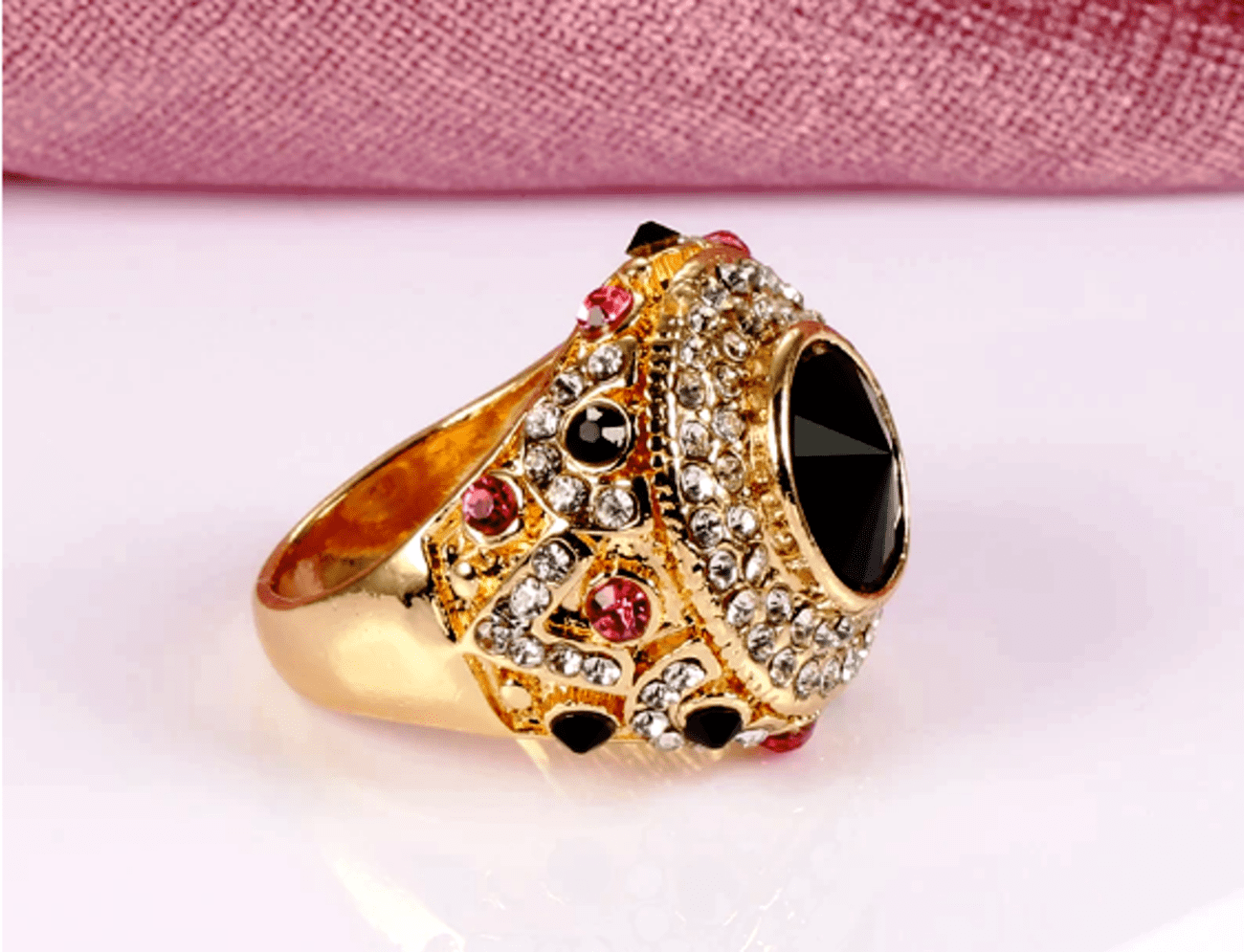 Dieser Ring goldfarben schwarz Strass ist aus einer Kupfer-Legierung gefertigt. Der Ring hat eine schmale zierliche Schiene und ist sehr filigran gearbeitet. Dieser schön verzierte Ring sieht sehr edel aus.